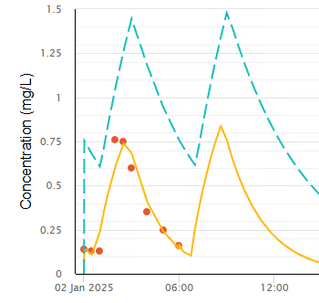 Both software tools utilising Bayesian methods provided acceptable relative bias and precision of cumulative exposure estimations under the tested sampling scenarios. Relative bias ranged from median RE of 0.114.6% using InsightRX and from 3.47.8% using NextDose. Precision ranged from median RMSE of 0.190.32 mg·h·L−1 for InsightRX and 0.080.1 mg·h·L−1 for NextDose.