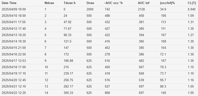 You may ignore the last dose (e.g. Table 1, Ndose=14) because the AUCocc includes the “tail” of concentrations predicted after the last dose so does not reflect a steady state dosing interval.